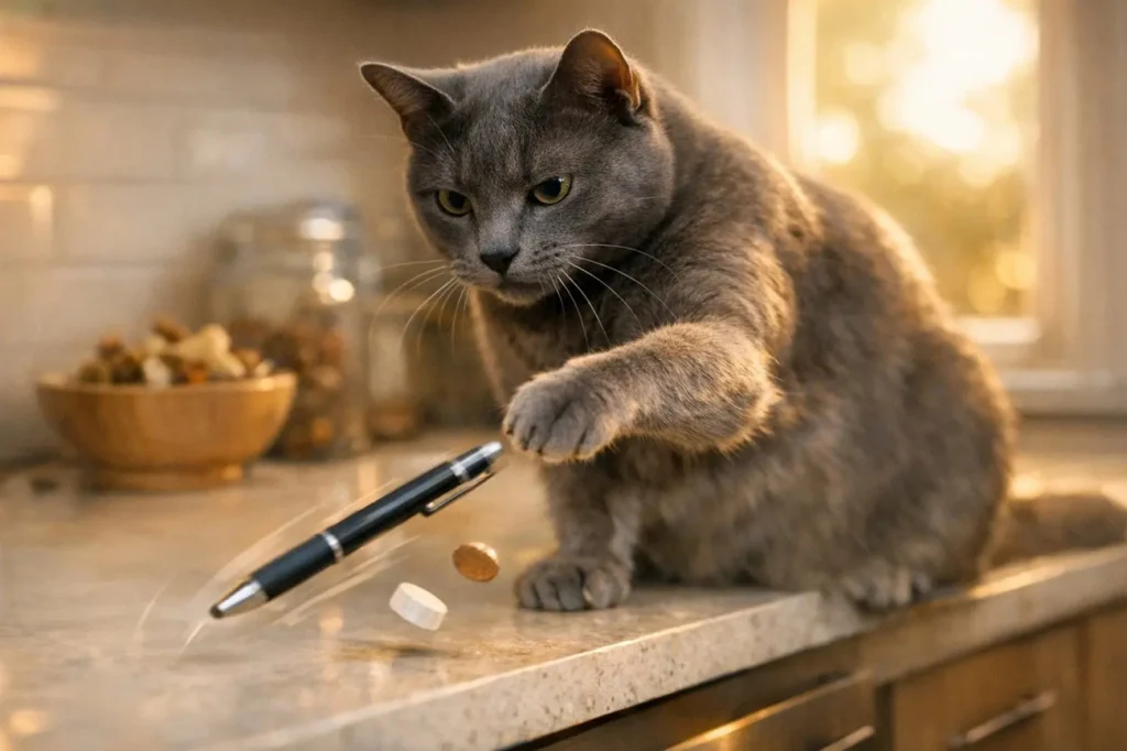 Os motivos pelos quais gatos derrubam objetos vão além de simples travessura. Na natureza, felinos tocam e empurram possíveis presas para avaliar se estão vivas, se se movem ou se oferecem risco [1]. Dentro de casa, canetas, chaves, copos e outros itens ao alcance da pata viram “presas” previsíveis e seguras [1]. Quando um objeto cai, produz som, movimento e, às vezes, reação imediata dos tutores, o que ativa a curiosidade do animal [1].